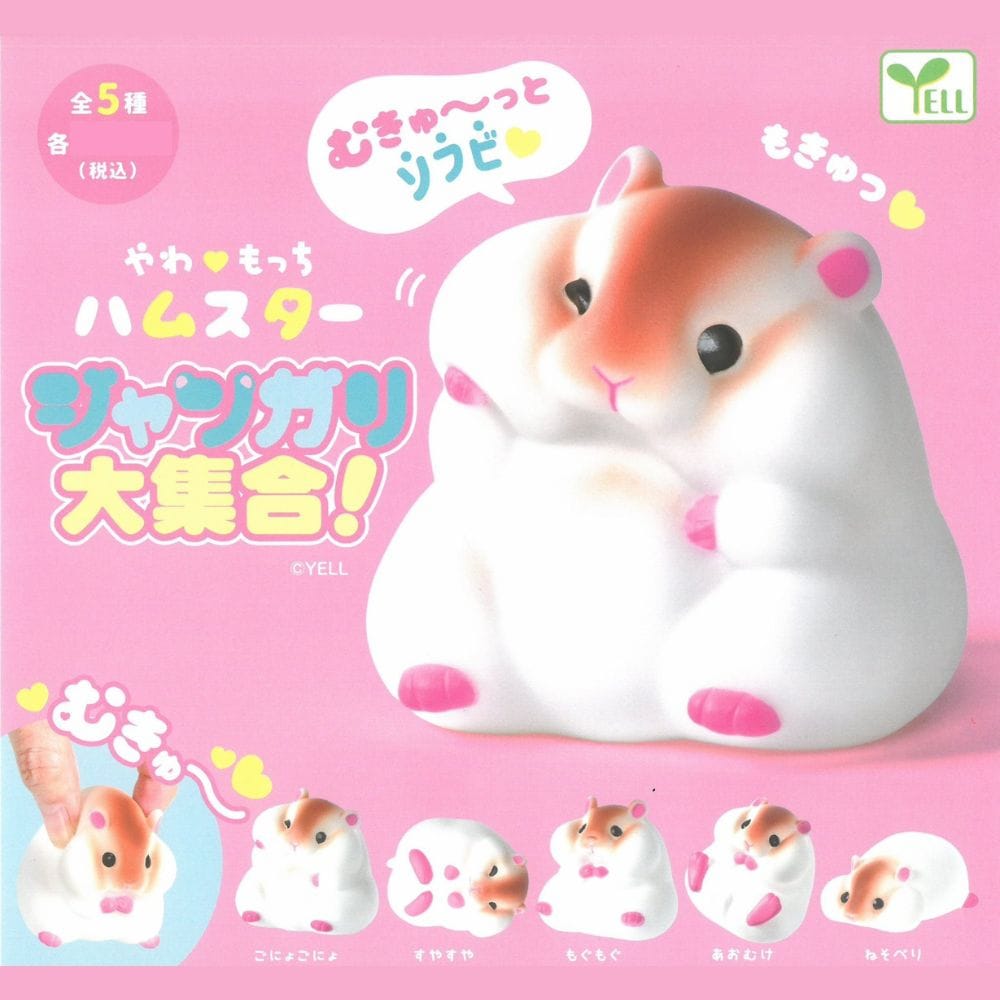 Le gachapon hamster qui fait craquer instantanément. La série Yawa-mocchi Djungarian Grand Collection de YELL capture le hamster nain en matériau souple et dodu dans ses 5 poses les plus attendrissantes : il mange sa carotte, il dort, il se tortille, il fait le mort, il se prélasse. Cinq scènes de vie miniatures, directement importées du Japon.