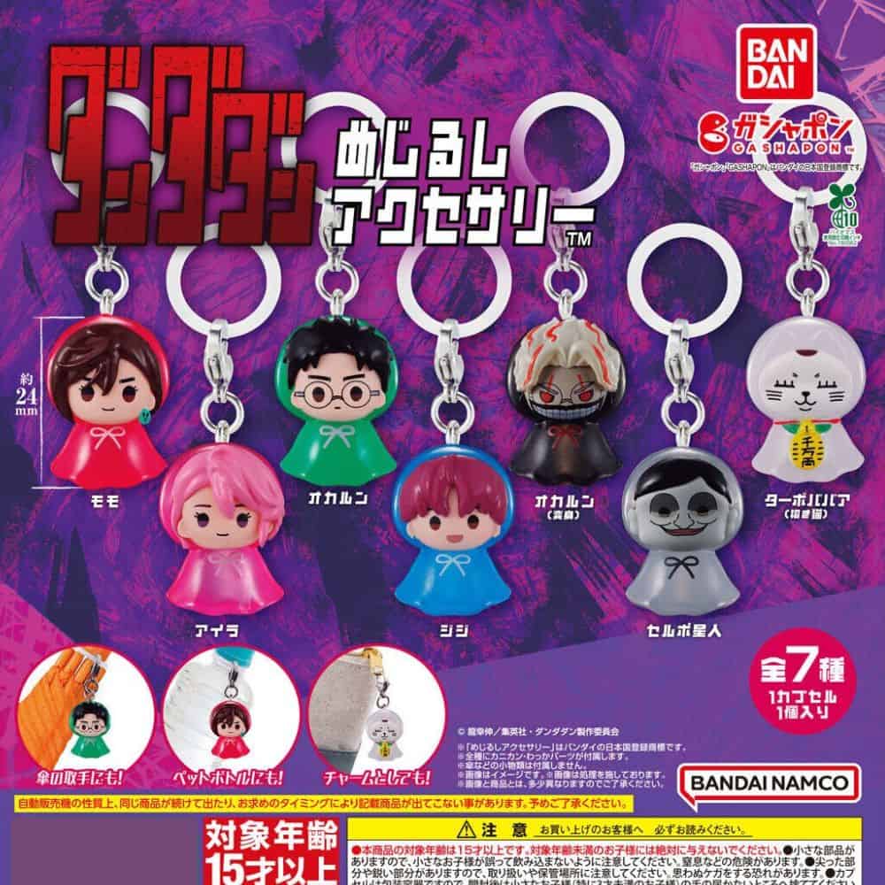 Cette série de Gashapon Dandadan Mejirushi comprend 7 accessoires représentant des personnages cultes de Dandadan :