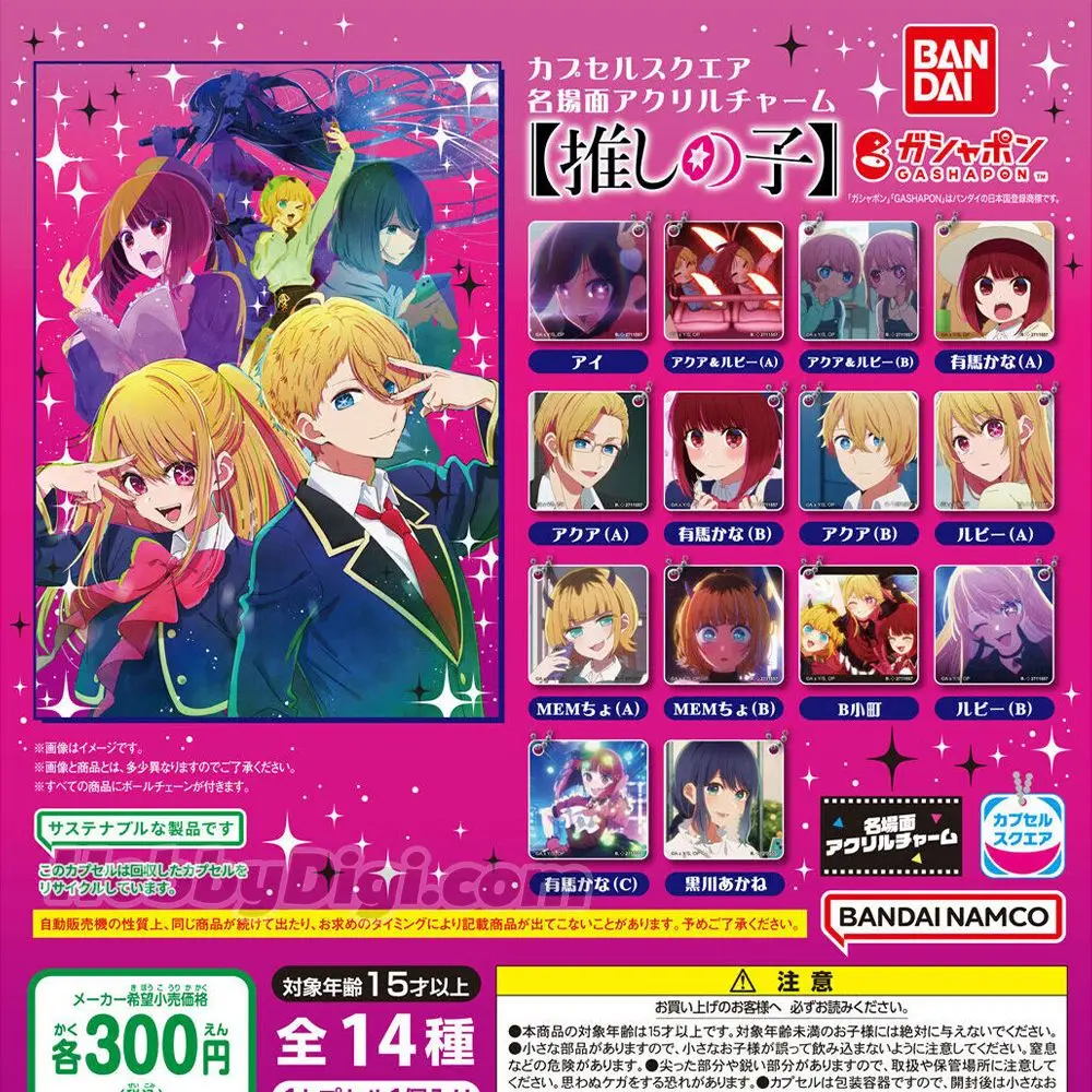 Dans cette série de Gashapon Oshi No Ko, découvrez et collectionnez les scènes cultes de ce manga/anime sous forme de porte clés/pendentif en acrylique.