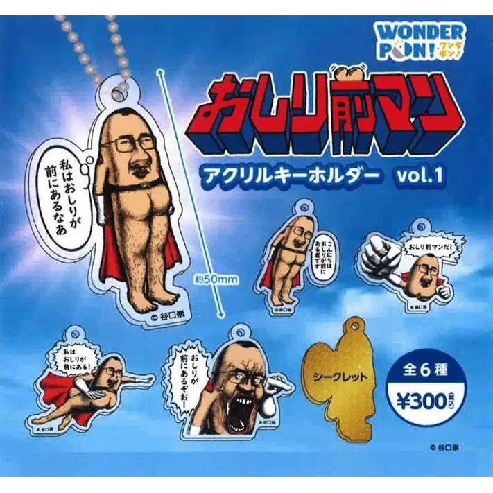 Plongez dans l’univers décalé et humoristique avec cet ensemble unique de Gashapon Oshirimaeman. Chaque capsule renferme un porte-clés acrylique inspiré du personnage « Oshirimaeman », l’homme aux fesses devant, une figure emblématique au Japon pour son côté absurde et hilarant qui prononce dans une bulle du texte en japonais, qui signifie « Je suis l’homme au fesses devant » mais dit de différentes façons sous différents niveaux de politesse. Parfait pour les amateurs de produits dérivés insolites et de collection.